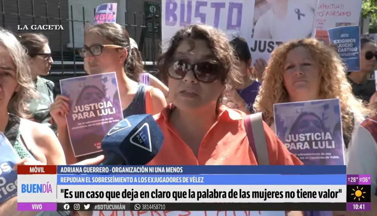 Referentes del movimiento Ni Una Menos se manifestaron este miércoles frente al Ministerio Público Fiscal, ubicado en Sarmiento al 400, en San Miguel de Tucumán, para rechazar el sobreseimiento de los cuatro ex jugadores de Vélez denunciados por presunto abuso sexual contra una joven tucumana y denunciar que la Justicia “descree la palabra de las mujeres”.