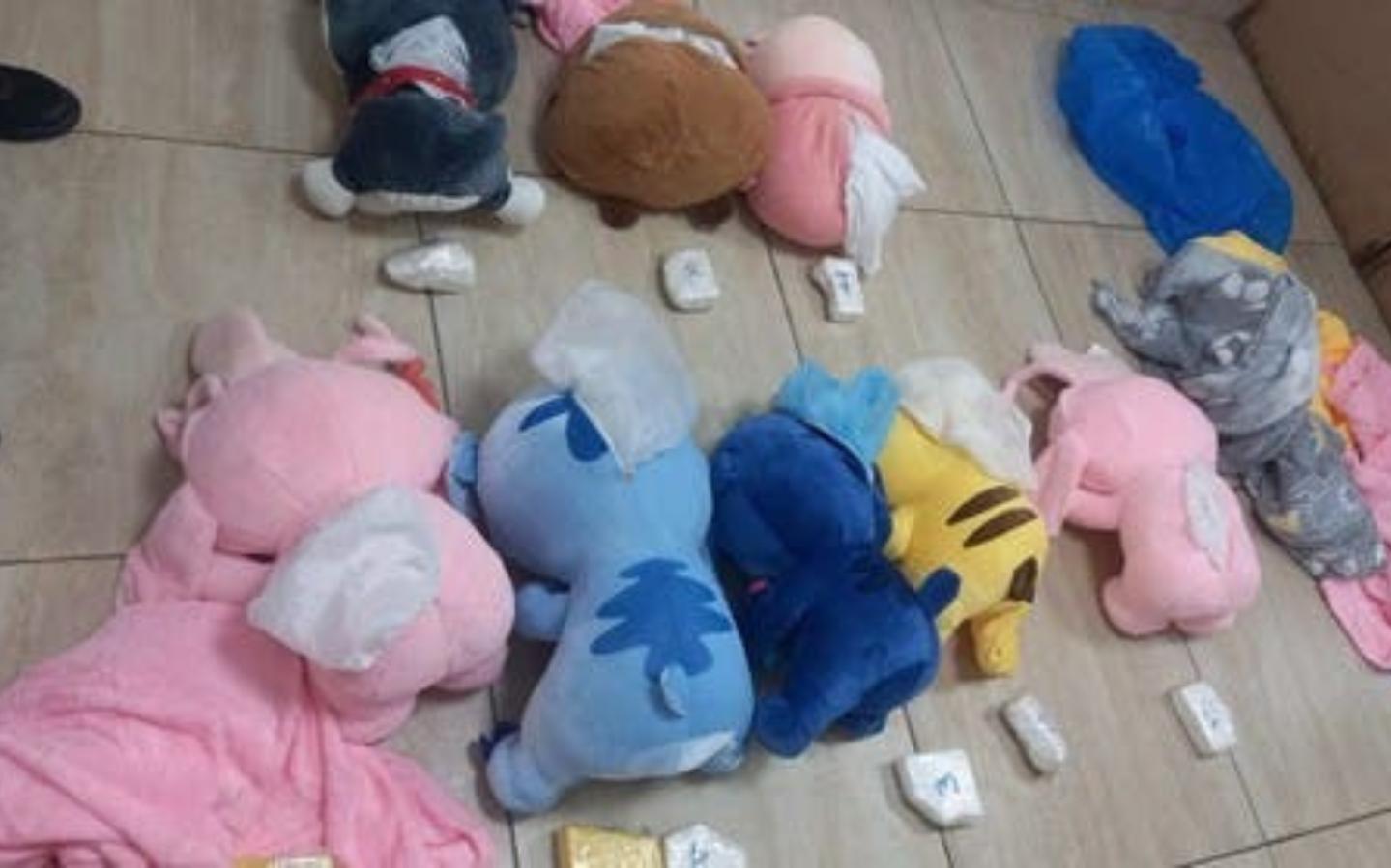 Ante la señal del can, los uniformados realizaron una revisión minuciosa. Primero notaron que los peluches pesaban más de lo normal, y luego descubrieron que cada uno tenía un cierre oculto en la costura. Al abrirlos, encontraron mantas que escondían nueve paquetes con una sustancia blanquecina.
